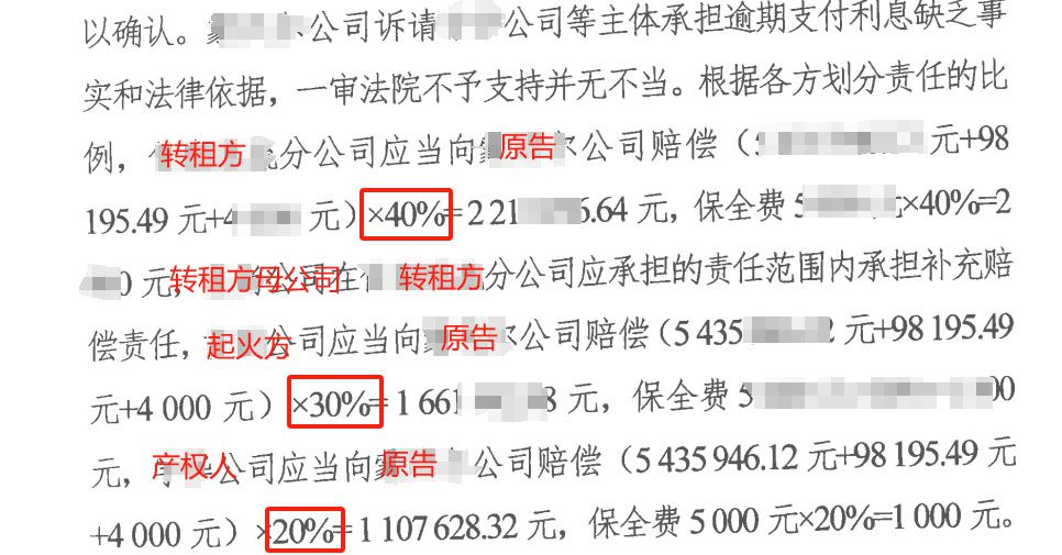最终,经法院二审判决,作为产权人的某电器公司承担20%主要过错责任,作为转租人的某物流公司承担40%过错责任,某供应链公司作为起火方承担30%过错责任,承租商户自担10%责任。