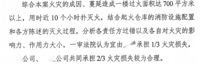 我们对相关重点问题进行了调查取证,向法院提交了详细的代理意见。最终,一审法院审理采纳了我们的意见,判令起火方卢某承担1/3的责任,房屋所有权人粮油公司承担2/3的责任。