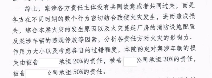 最终一审法院认定,起火方仅承担50%,产权方30%责任,货车司机自担20%的责任;二审维持一审判决结果。