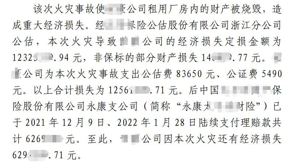 由于委托人为其设备和货物购买了财产保险,在本案正式进入诉讼程序之前,保险双方就本次保险事故造成的损失进行了公估核损工作。经国内某知名保险公估公司出具公估报告显示:本次火灾造成被保险人损失为1232万元。保险公司依据保险合同实际赔付629万元,剩余部分还需要继续向其他责任方索赔,遂向人民法院提起诉讼。